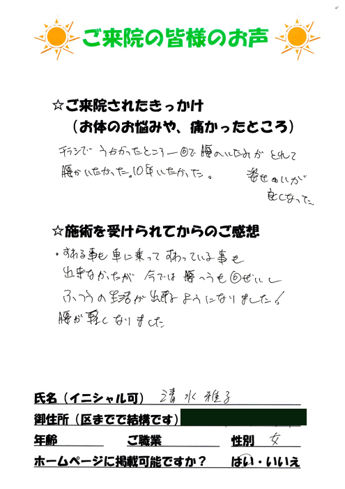 チラシでうかがったところ、一回で腰のいたみがとれて、姿勢が良くなった。腰がいたかった。10年痛かった。