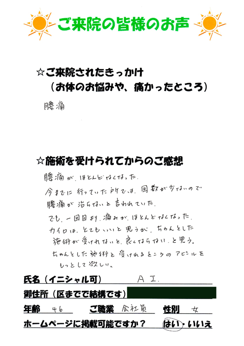 今までに行っていた所では、回数が少ないので腰痛が治らないと言われていた。でも一回目より痛みがほとんどなくなった。カイロはとてもいいと思うが、ちゃんとした施術がうけれないと良くならないと思う。ちゃんとした施術をうけけれるところのアピールをもっとして欲しい。