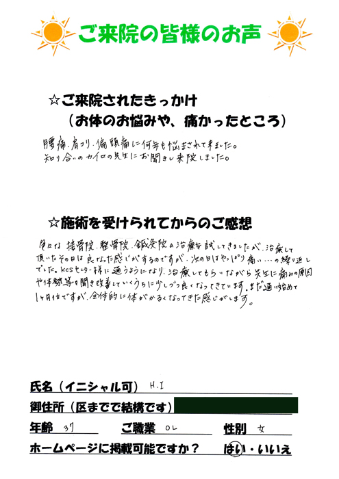 H・I 様 女性 37歳 腰痛・肩コリ・偏頭痛