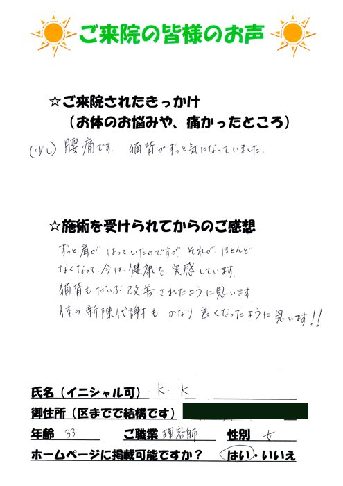 H・I 様 女性 37歳 腰痛・肩コリ・偏頭痛